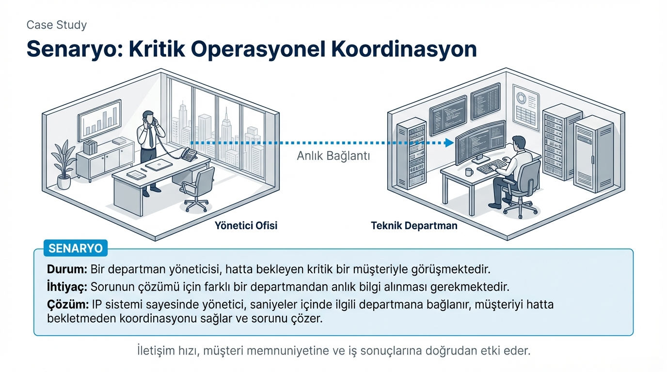 Bir departman, kritik bir müşteriyle görüşürken başka bir departmana saniyeler içinde bağlanarak koordinasyonu sağlayabilir.