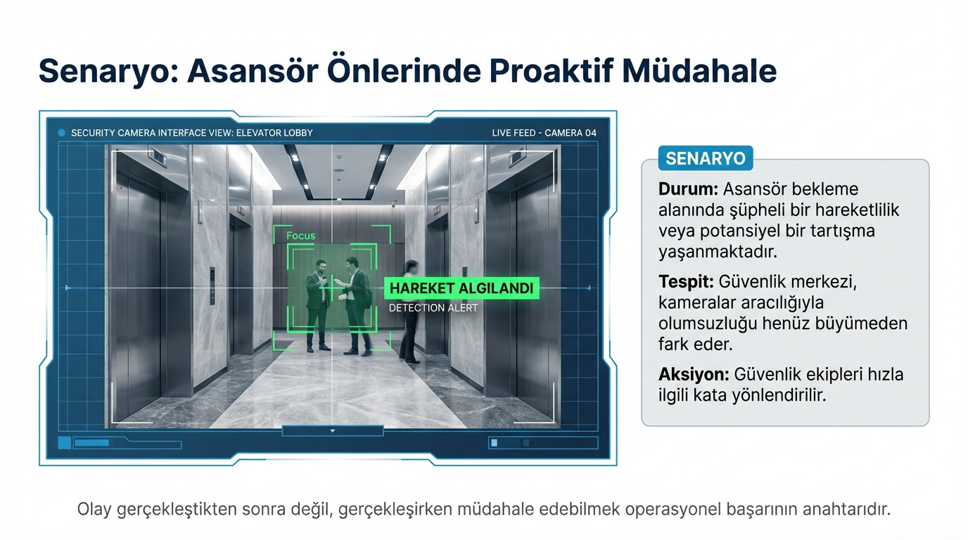 Asansör önlerinde yaşanabilecek olumsuzluklar kameralar sayesinde hızla tespit edilip müdahale edilir.