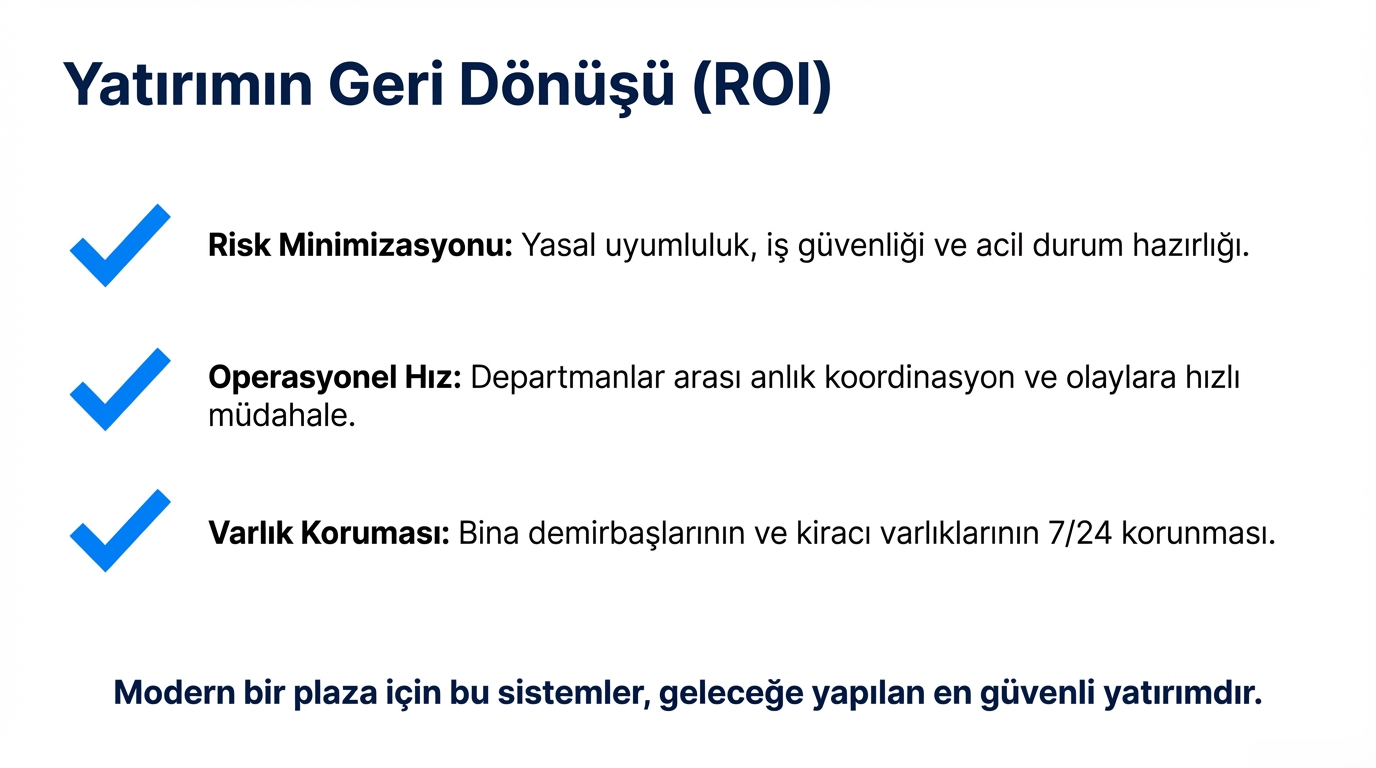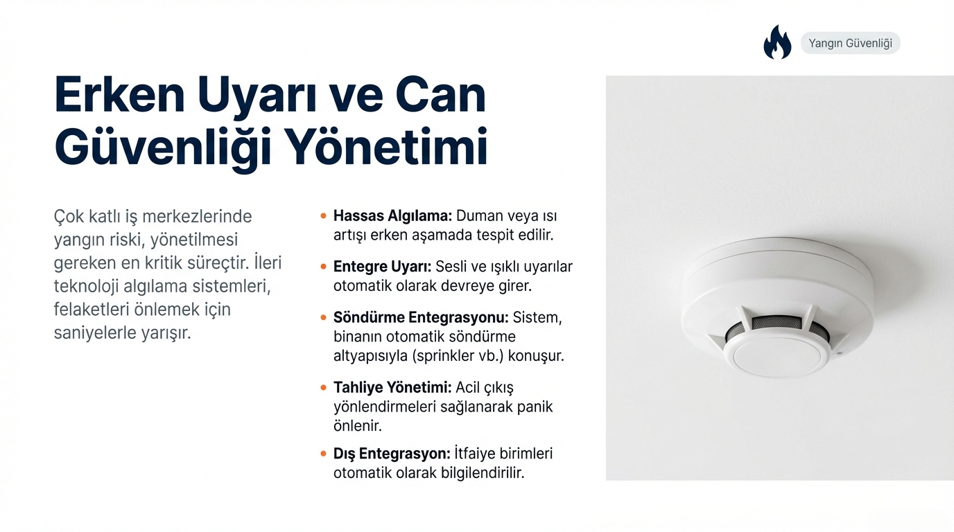 Çok katlı iş merkezlerinde yangın riski yüksek olduğundan bu sistemler kritik önem taşır. Bu sayede:
