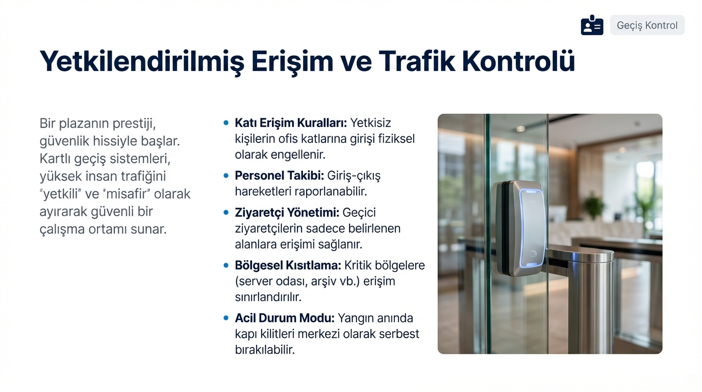 İş merkezlerinde yüksek insan trafiği sebebiyle geçiş kontrolü çok önemlidir. Bu sistemlerle: