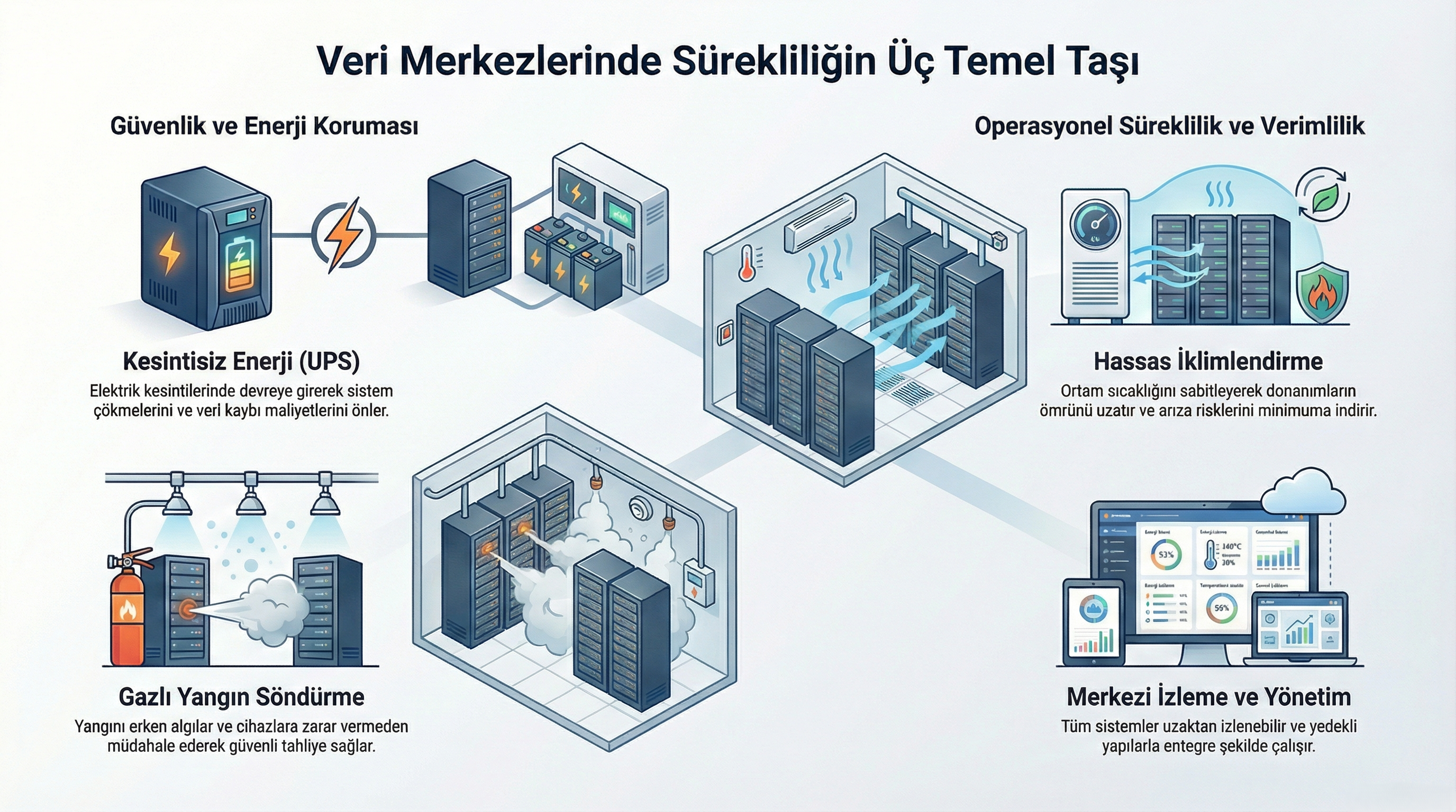 Veri merkezlerinde enerji sürekliliği hayati öneme sahiptir. Bu sistemlerle: