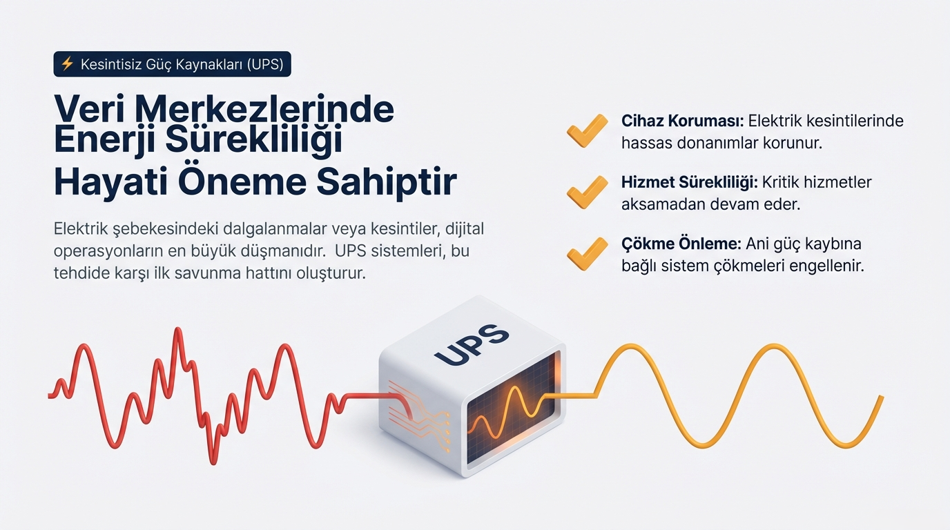 Örneğin anlık bir elektrik kesintisinde UPS devreye girerek sunucuların kapansız çalışmasını garanti eder.