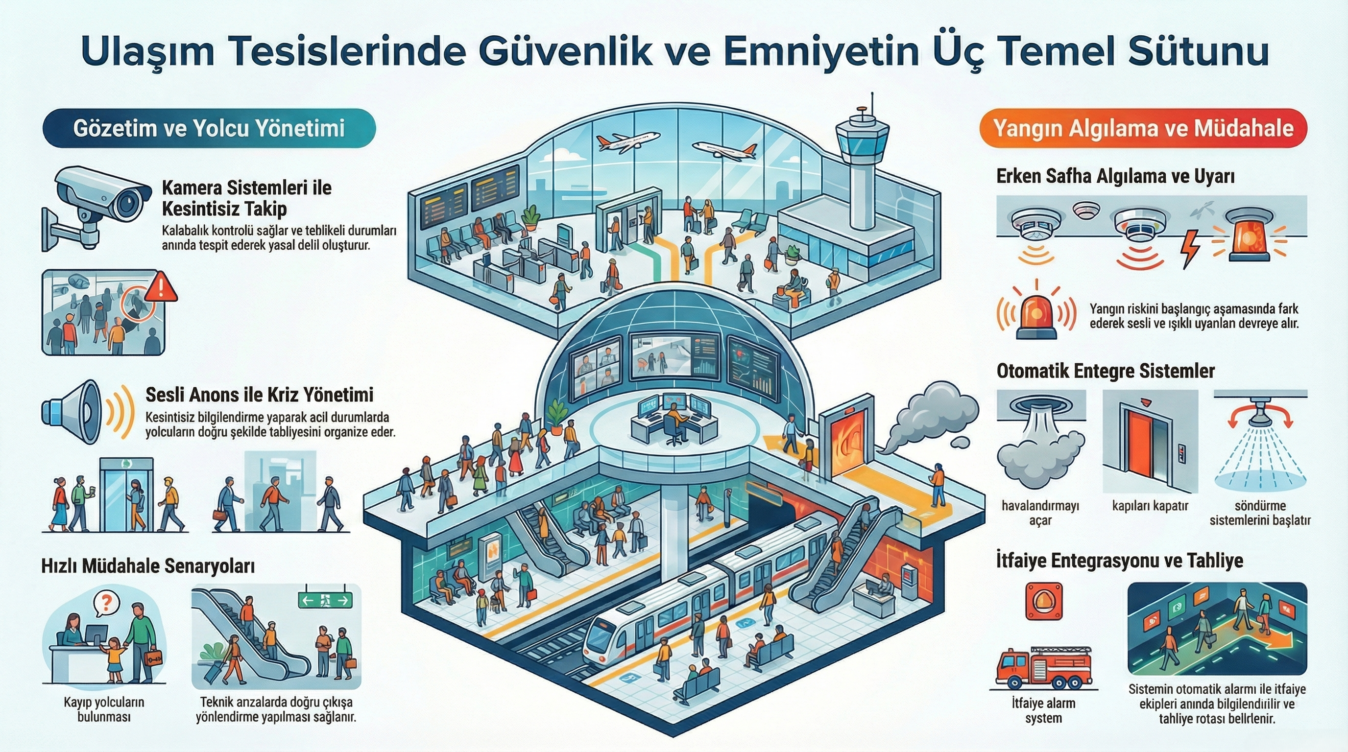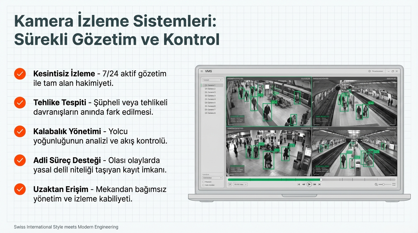 Toplu ulaşım alanlarında güvenlik için kamera sistemleri kritik rol oynar. Bu sistemlerle: