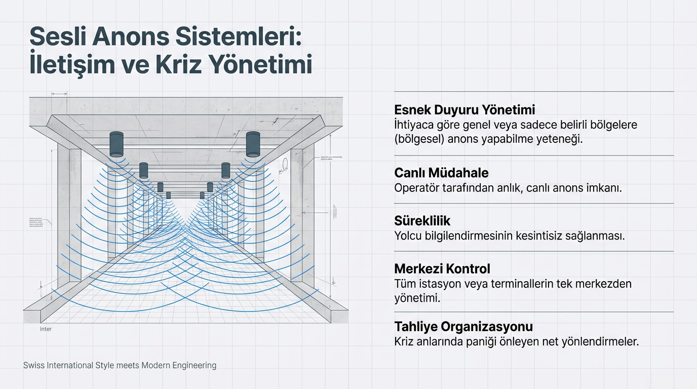 Ulaşım tesislerinde yönlendirme ve kriz yönetimi için anons sistemleri zorunludur. Bu sistemlerle: