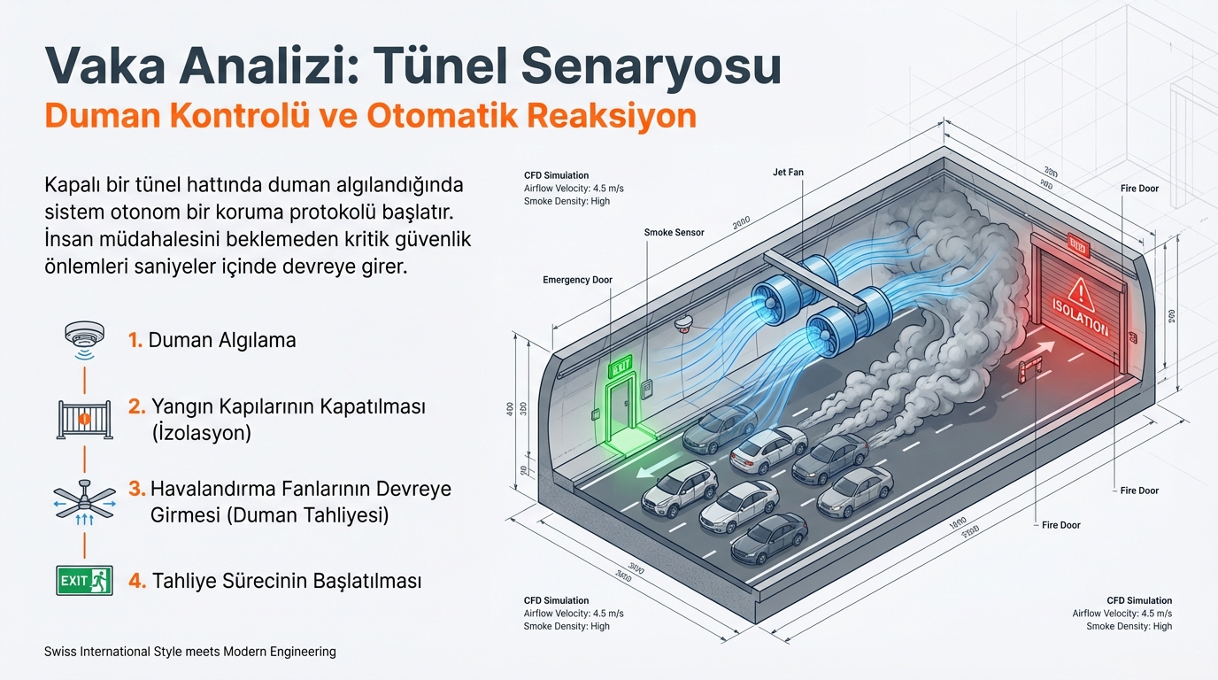 Bir tünelde oluşan duman algılandığında sistem kapıları kapatır, havalandırmayı devreye alır ve tahliye sürecini başlatır.