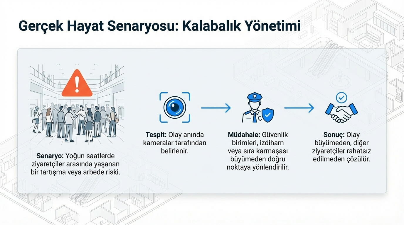 Yoğun saatlerde yaşanan bir arbede kamera ile tespit edilerek güvenlik görevlileri anında müdahale edebilir, olay büyümeden çözülebilir.