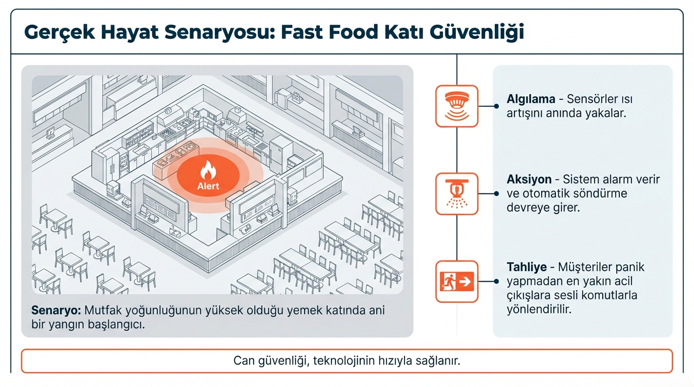 Bir fast food katında çıkan yangın kısa sürede algılanır, sistem uyarı verir, müşteriler güvenli şekilde yönlendirilir.