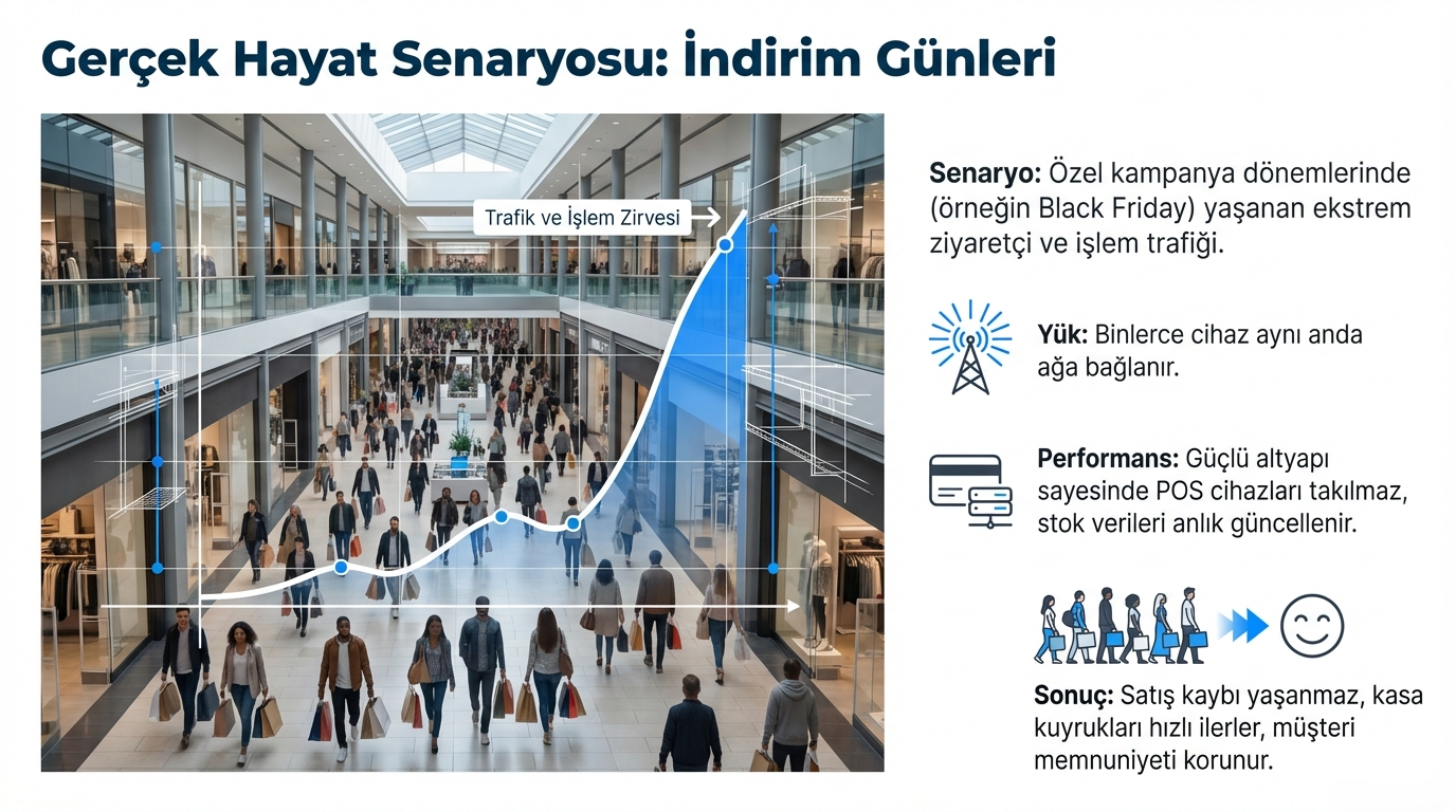 Yoğun bir indirim gününde ağ altyapısının kesintisiz çalışması sayesinde hem satışlar hem müşteri memnuniyeti yüksek kalır.