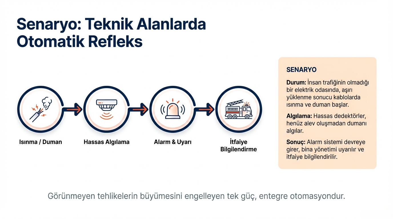 Elektrik odasında meydana gelen bir ısınma kaynaklı duman, algılayıcılar sayesinde kısa sürede tespit edilir ve alarm devreye girer.