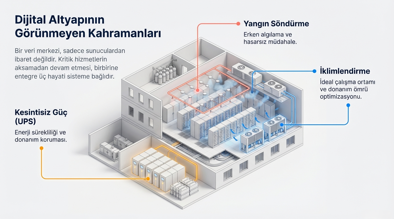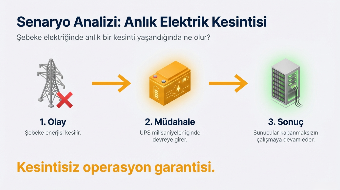 Örneğin anlık bir elektrik kesintisinde UPS devreye girerek sunucuların kapansız çalışmasını garanti eder.