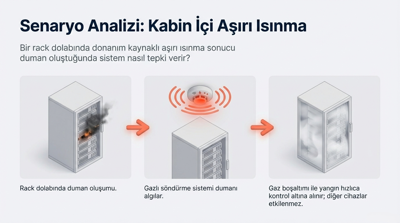 Bir rack dolabında aşırı ısınma sonucu çıkan duman, gazlı söndürme sistemiyle hızlıca kontrol altına alınabilir.