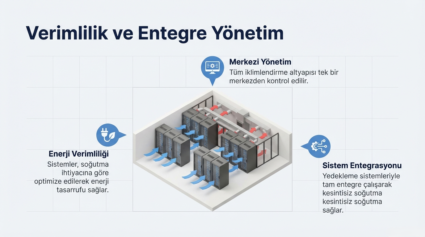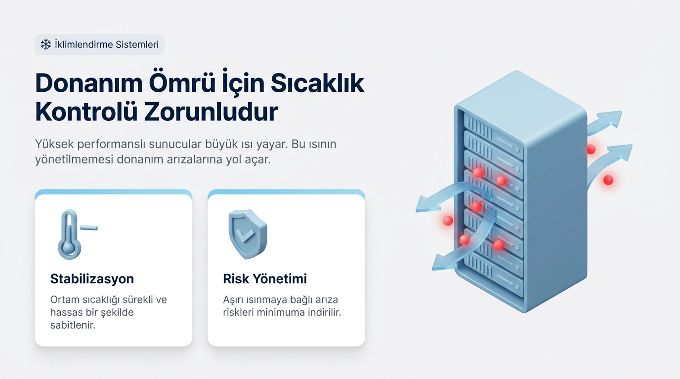 Veri merkezlerinde donanımların ömrü için sıcaklık kontrolü zorunludur. Bu sistemlerle: