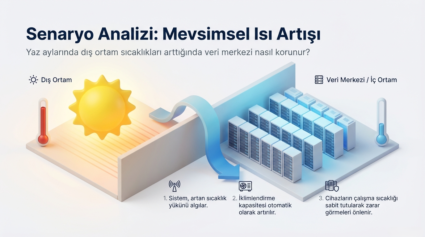 Yaz aylarında artan sıcaklıklara karşı iklimlendirme sistemi otomatik devreye girerek cihazların zarar görmesini önler.