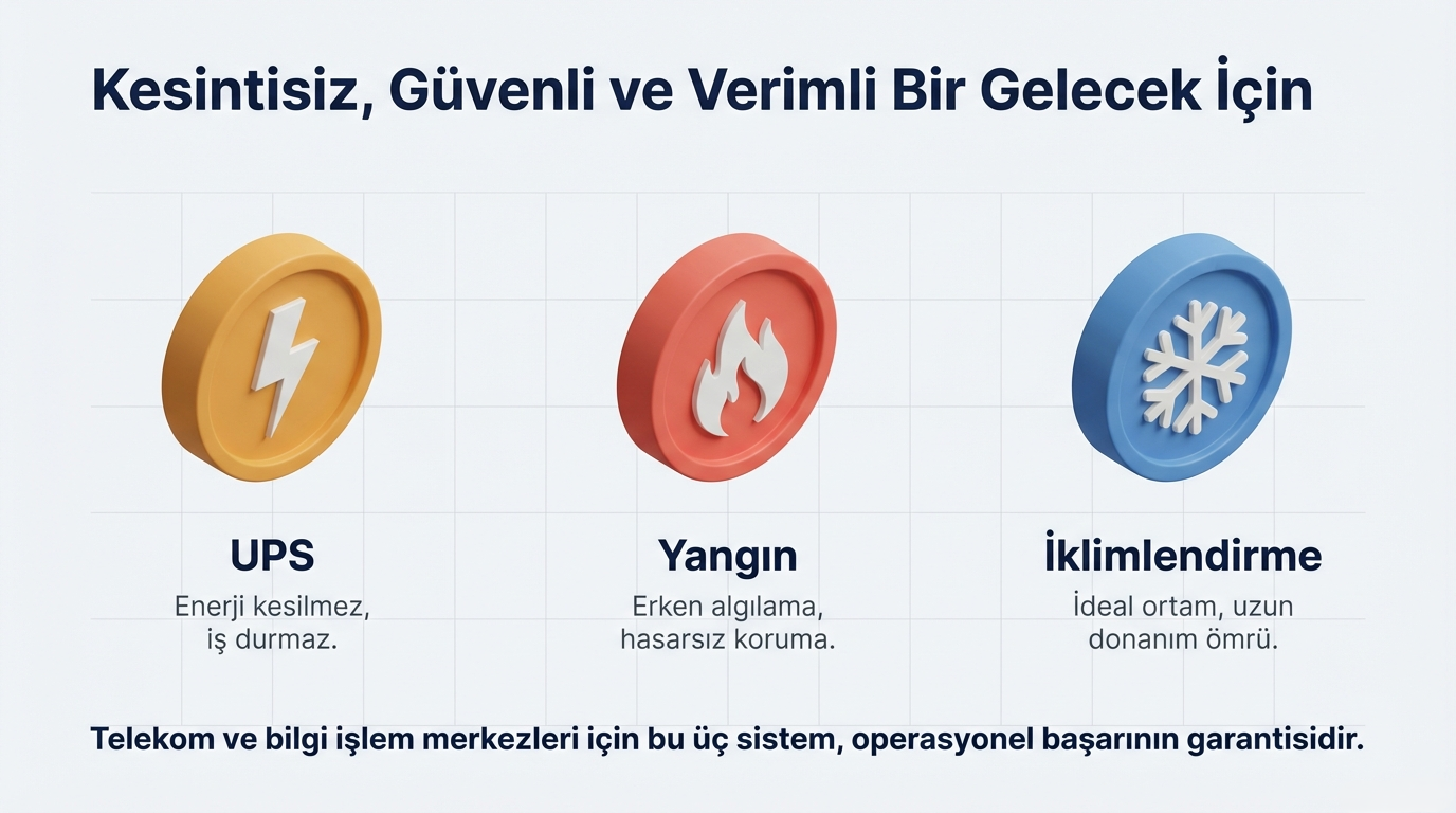 Veri merkezlerinde enerji sürekliliği hayati öneme sahiptir. Bu sistemlerle: